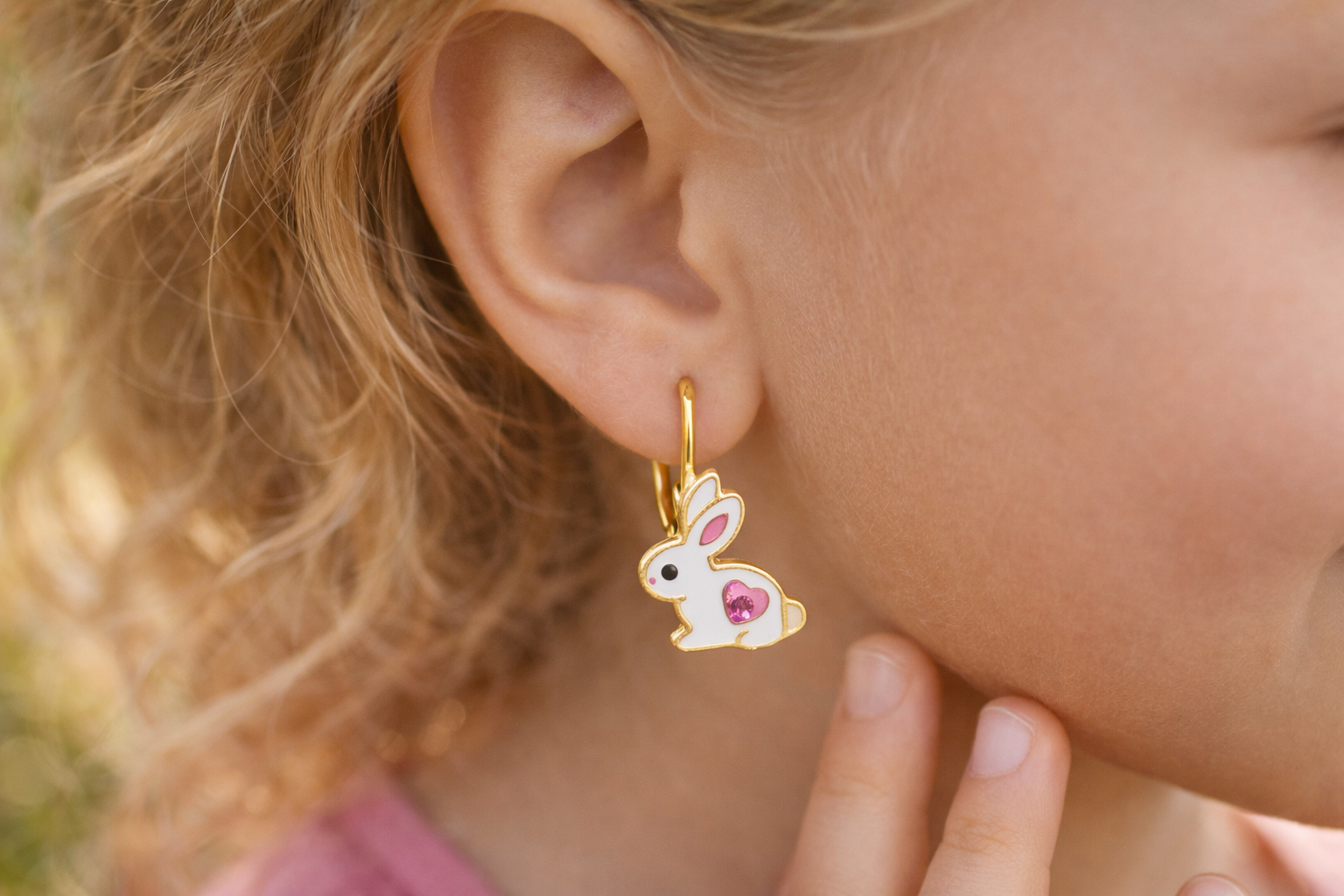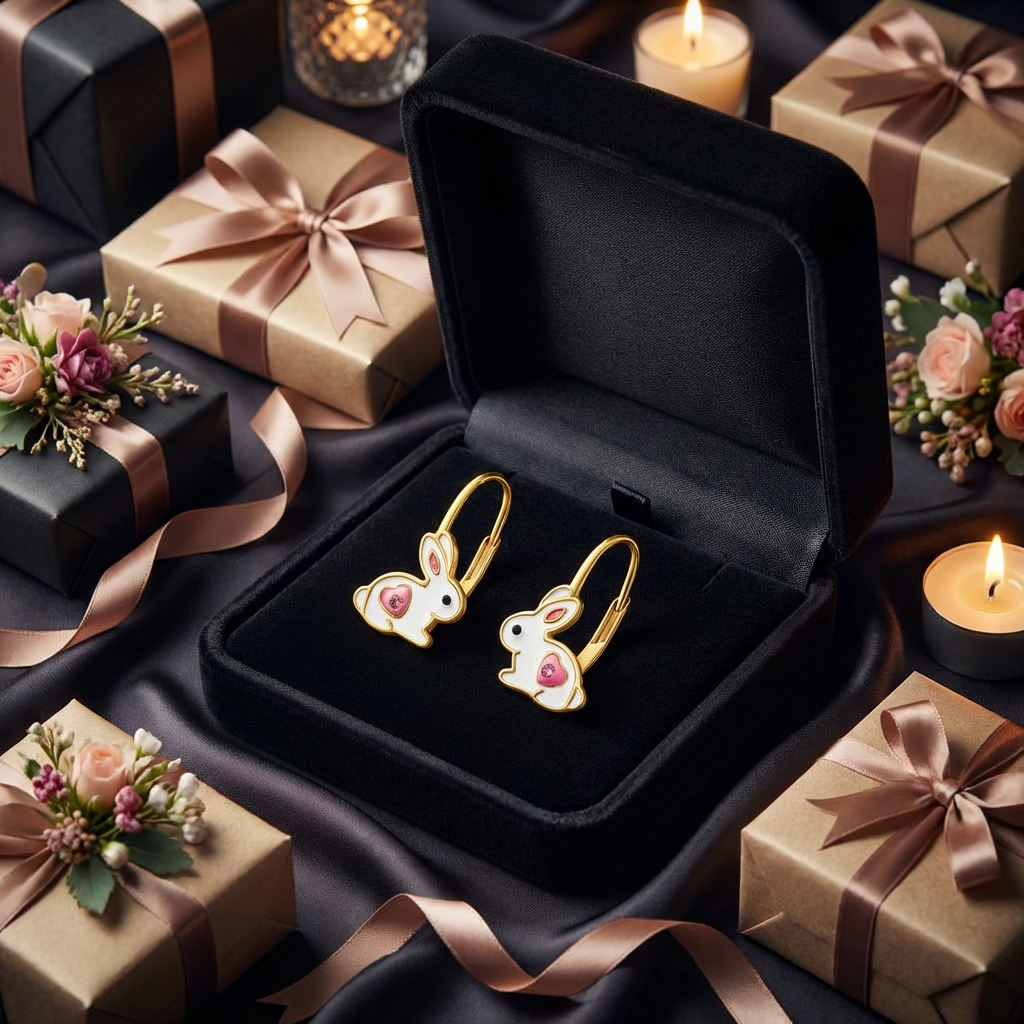 Das Design-Detail macht das Paar zum Lieblingsstück: Ein liebenswertes Hasenmotiv mit einem zarten rosa Herz setzt sanfte Farbakzente, ohne zu dominieren. Die ruhige Farbgebung macht es vielseitig – perfekt zum Schulstart, für Geburtstage oder Familienfeste, aber auch als erstes, behutsam eingeführtes Schmuckstück für ganz kleine Entdecker.